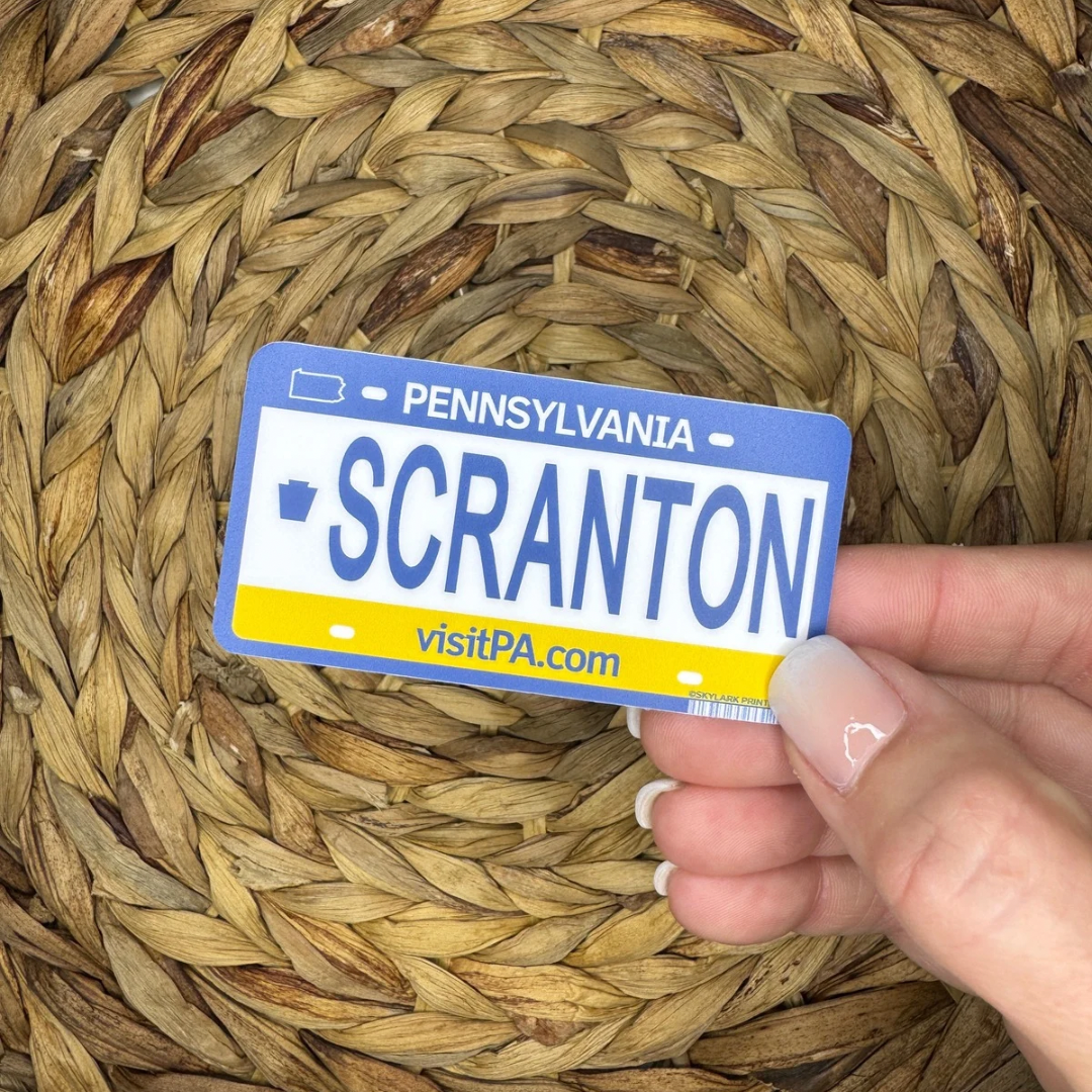 Celebrate the quirky charm of Scranton, Pennsylvania — hometown of the hit TV show The Office — with this custom 3” wide license plate sticker! Perfectly sized for everyday use, this sticker brings a fun nod to Dunder Mifflin’s favorite city. Whether you’re personalizing your laptop, decorating your water bottle, or giving your phone case a comedic twist, this sticker adds a nostalgic touch for any true fan of the show.